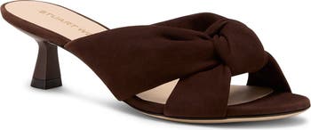 A voluminous knot centers the the wide straps on a Spanish-made sandal shaped from supple suede and set on a sculptural kitten heel.