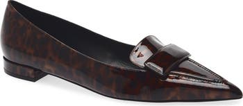 A dramatically pointed toe balances the low, walkable heel of a flat designed with a glossy finish and loafer profile accented with a floating cross strap. The sleek, low silhouette makes an effortless complement to relaxed-formal looks and smartly tailored outfits alike.