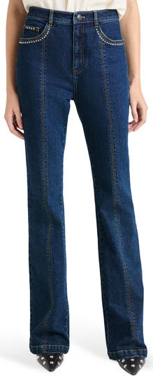 Topstitching traces the groovy silhouette of flare-leg jeans turned to the perfect fade and accented with shiny studs to frame the pockets.