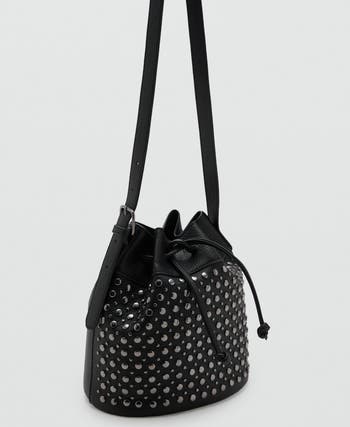 Polished studs add shine and texture to this faux-leather bucket bag that carries your essentials while making a modern style statement.