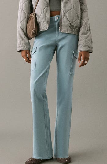 Polished stud accents highlight the front scoop and cargo pockets of these low-stretch denim jeans, adding a modern edge to this classically casual look.