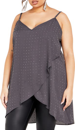 High-shine studs add night-out appeal to this longline cami made in a frilly wrapped silhouette for graceful movement.