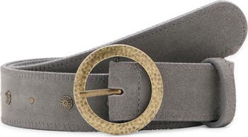 A hammered round buckle and stud accents add an eye-catching touch to an everyday belt crafted from distressed leather to elevate your look.