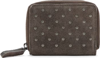 Aged-finish studs highlight the supple suede exterior and compact profile of a convenient pouch perfect for storing your essentials cards and coins.