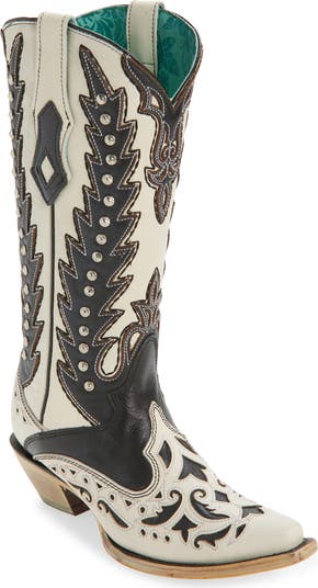 Eye-catching details like intricately stitched overlays and polished stud accents stand out on this sleek western boot made from rich leather.