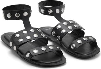 Shiny round studs punctuate the wide straps of this leather sandal that will add understated edge to your ensemble.