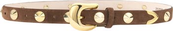 Gleaming conical studs and polished hardware stank in sleek contrast to the textural finish of this belt that gives your look a refined-meets-edgy touch.