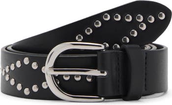 Illuminate your everyday look with the polished, studded hardware along this slender belt shaped from soft faux leather.