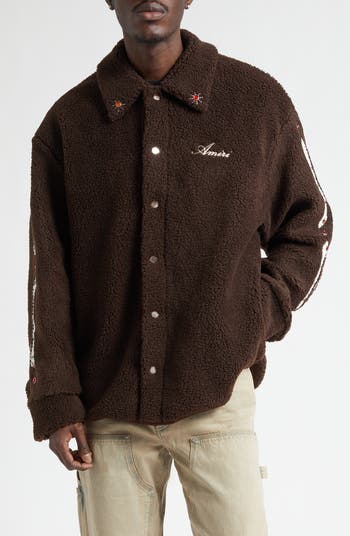 Built for cold nights and strong entrances, this fleece overshirt brings Western-inspired panache and snap-front polish, then seals it with embellished bone detailing that glints like hardware under stage lights.
