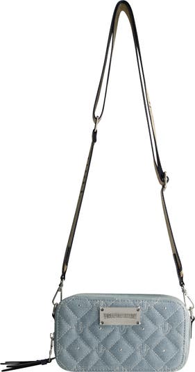 Elevate your everyday style with the True Religion Studded Denim Camera Bag. Featuring a quilted denim exterior adorned with signature horseshoe stitching and studded detailing, this compact yet spacious crossbody bag delivers both fashion and function. The bold True Religion-branded adjustable strap offers versatile styling, while dual zippered compartments ensure secure storage for your essentials. Finished with a sleek metal logo plaque and stylish tassel zipper pulls, this bag is the perfect blend of casual-cool and designer edge. Perfect for on-the-go fashionistas, this bag is your go-to for a stylish, hands-free look!