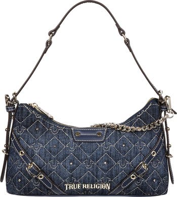 Elevate your look with the True Religion Studded Denim Chain Shoulder Bag. Crafted from dark wash quilted denim with signature horseshoe stitching, it’s adorned with gold-tone stud accents for a touch of edge. Featuring both a leather shoulder strap and a detachable chain handle, this versatile bag transitions effortlessly from day to night.