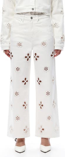 Glossy studs illuminate the whimsical floral eyelets on stretch-hinted jeans featuring a high rise and classic straight-leg silhouette.