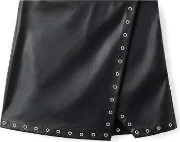 Gleaming grommets bring moto-inspired edge to this smooth faux-leather miniskirt cut in a sassy faux-wrap silhouette.