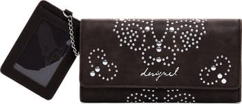 Polished studs in a butterfly motif lend a fanciful flourish to an elongated faux-leather wallet designed with a chain-tethered ID/card holder.