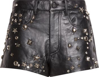 A varied assortment of polished pyramid studs, stars and bezel-set crystals adorn these lambskin-leather shorts cut in a classic five-pocket design.