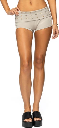Polished studs mark the fold-over waistband of these ultrashort shorts that complete your look with retro flair.