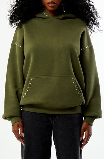 Think plush and unruly: a relaxed cotton-blend hoodie with dropped shoulders that give it that borrowed-from-someone-cool drape. The gleaming studs add a hit of shine that feels bold, a little dangerous and fully intentional.
