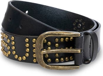 The antiqued studs on this smooth calfskin-leather belt don't exactly spell out 'rock 'n' roll,' but the attitude's all there.