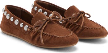 Polished studs and a moc toe bring plenty of retro vibes to this smooth suede loafer.