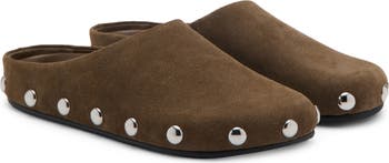 Polished studs punctuate the midsole and create a retro aesthetic on a streamlined leather mule featuring a contoured footbed for a customized feel.