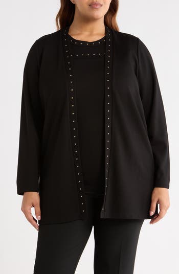 Glossy studs trim the open front of this casual-yet-cool cardigan hit with a bit of edgy charm for a more modern feel.