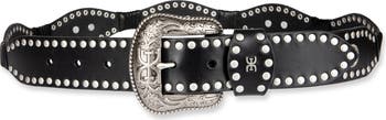 Wrap up your look with the Western flair of this leather belt dotted with matted studs that highlight the scalloped shape. An etched nickel buckle completes the style.