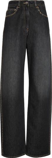 In inky-black denim with a dense handfeel, these straight-leg jeans draw a precise line then send a parade of gleaming studs down each side seam. A gilded Medusa-head button signs the waist as a tribute to the molded door of the maison’s first headquarters.