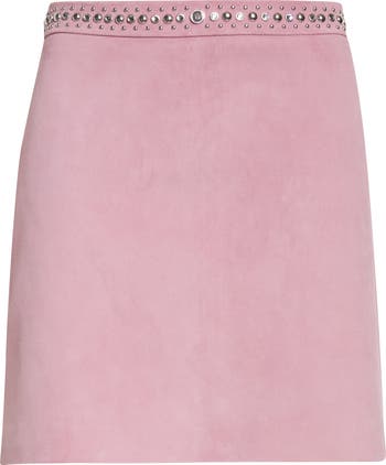 Crafted in Italy from buttery lambskin suede in a dusty mauve shade, this miniskirt is embellished at the waist with rows of shimmery crystals and polished dome studs. A singular center Medusa stud adds a signature touch, symbolizing power and seduction.