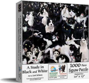 Dive into the world of Lori Schory with SunsOut's "A Study in Black and White," a 1000-piece jigsaw puzzle that weaves a mesmerizing story of black and white cats. Crafted with precision in the USA from high-quality recycled cardboard, this durable puzzle presents a perfect blend of relaxation and challenge. The eco-friendly materials used, including recycled cardboard and soy-based inks, reaffirm your commitment to sustainability while you indulge in this delightful pastime. SunsOut, a proudly woman-owned small business, ensures a smooth puzzling journey with a worry-free guarantee that any missing or damaged pieces will be promptly replaced. The 20" x 27" puzzle not only promises to serve as a perfect centerpiece for family game nights or solitary relaxation, but your purchase also supports economic empowerment, innovation, and environmental responsibility. Whether you are a seasoned puzzler or a newcomer, SunsOut's 1000-piece jigsaw puzzle invites you to a rewarding exploration of artistry and sophistication, turning puzzle-solving into shared moments of joy.