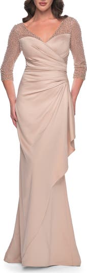 Ruched satin mother of the bride dress with ruffle detail on the skirt. Three quarter sleeves with beaded detail. Back zipper closure.