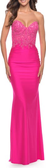 La Femme Stunning Strapless Jeweled Lace and Jersey Dress in Neon Pink, Main, color, Neon Pink