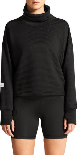 Practically made for movement, this jersey sweatshirt features tonal stripes, a slouchy turtleneck and thumbhole cuffs that warm your hands.