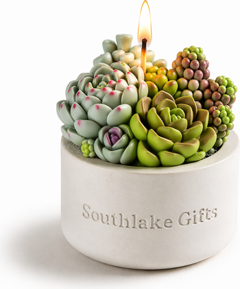 A succulent candle in a concrete vessel designed to resemble a realistic plant arrangement, featuring hand-sculpted succulent leaves in natural green and soft muted tones for modern home décor and gifting. Carefully painted for lifelike detail, this scented candle doubles as a decorative piece, adding a calm, organic touch to shelves, desks or living spaces while maintaining a clean, minimalist aesthetic.