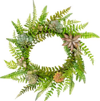 Add a touch of nature to your spring decor with this succulent wreath. Assorted succulents are arranged on a circular twig backing. Hang anywhere in your home or office, or use as a centerpiece with your favorite candle. Product Features: Mixed succulent springtime wreath Accented with green ferns and foliage Natural twig grapevine backing for hanging Recommended for indoor use - if using outdoors place under a covered area No assembly required - wreath comes in 1 piece Dimensions: 22" diameter (measured from outermost edge to outermost edge across the wreath) Inner ring dimensions: 10.5" diameter Material(s): polyester/twig/plastic/wire
