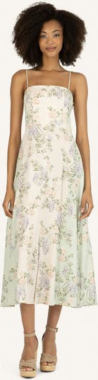 Super Natural by Secret Mission’s Sue Dress is crafted from a lightweight linen-blend fabric that offers a soft hand feel with a fluid drape. Designed in a pastel floral print, the silhouette features a clean, straight neckline and a seamed bodice for a softly contoured fit. Slender adjustable straps add a delicate touch, while the smocked back panel provides comfort and flexibility. The fitted bodice flows into an A-line midi skirt, creating graceful movement and an effortlessly refined finish.