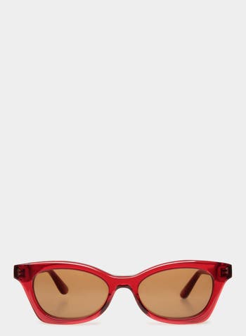 A modern take on vintage aesthetics, Sue is an iconic pair of sunglasses, seen here in red acetate with lenses. The curvilinear frames are sculpted into a subtle cat eye shape, juxtaposed with surprising geometries.