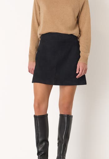 Structured high-waist mini skirt that sculpts the silhouette, offering a sumptuous hand-feel and confident modern elegance for day or evening.