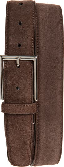Chocolaty suede distinguishes an Italian-made belt fitted with a gleaming buckle and ready to complete your favorite looks.