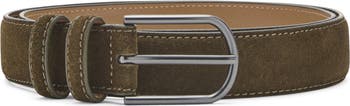 A brushed buckle highlights the supple suede exterior of a versatile belt that adjusts for a comfortable fit.