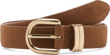 Gleaming hardware and crisp stitching highlight the supple suede exterior of a slender belt that adjusts for the perfect fit.