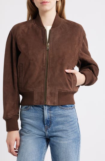 The bomber jacket is blowing up the trend report and this classic suede option, accented with rib-knit details, is a winning way to own the look.