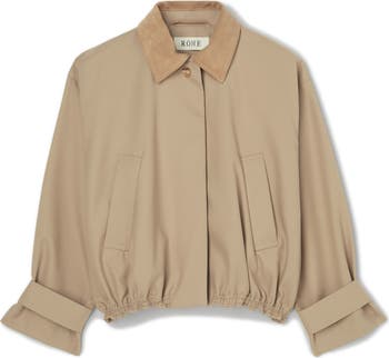 This trench-inspired bomber jacket made from crisp cotton is cut in an oversized fit and finished with a velvety suede collar. Designed with dropped shoulders and wide sleeves, it features belted button cuffs, balancing utilitarian detailing with a modern, sculptural silhouette.
