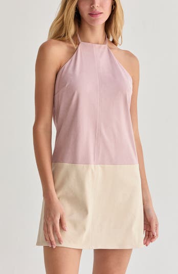 A sleek suede mini dress defined by a self-tie halter neckline and modern color-blocking. Clean lines, subtle seam detailing, and a sculpted fit create a refined silhouette with understated impact.