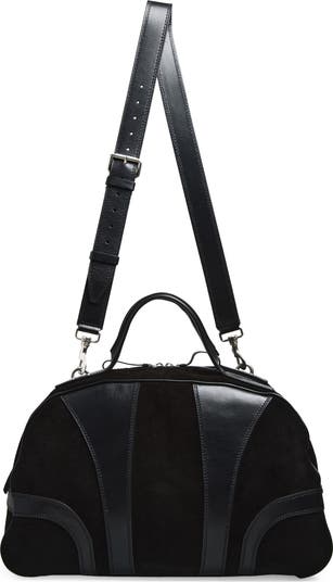 This iconic Italian-crafted suede duffle bag stitched with curved leather panels transports weekend essentials in style. Rolled top handles and a removable, adjustable buckle strap allow for versatile carry options.