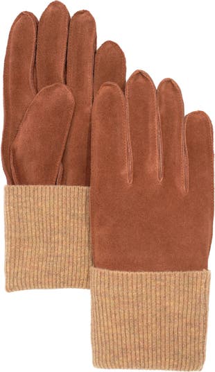 Suede Glove with Knit Rib — A refined mix of texture and function, this glove features a rich cow suede body accented by a rib-knit cuff in a warm wool blend. The soft fleece lining, made with recycled content, adds insulation without bulk. Finished with a subtly debossed logo, it’s a polished essential built for everyday wear.