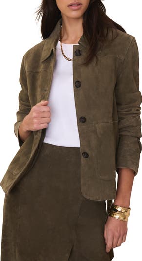 This suede jacket with a classic collar and button-front pockets brings timeless sophistication to everyday layering. Crafted from soft, supple suede, it features a clean button-front closure, structured collar, and functional patch pockets that add both style and practicality. The tailored yet relaxed silhouette offers an easy, flattering fit, making it perfect for pairing with everything from denim to dresses. Versatile and refined, this jacket is a polished outerwear essential that transitions seamlessly from season to season.