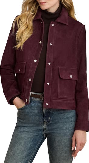 Logo-engraved snaps lend a heritage touch to this goatskin suede jacket that serves up timeless cool-weather style.