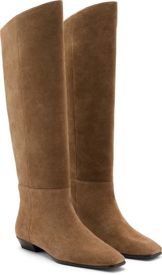 A curved topline refines the shape of this suede knee-high boot designed with a squared-off toe.