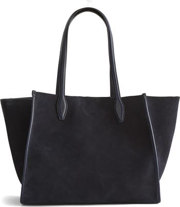 This softly structured tote designed with a magnetic snap closure has collapsible sides that close with a dog clip, which also doubles as a key fob.