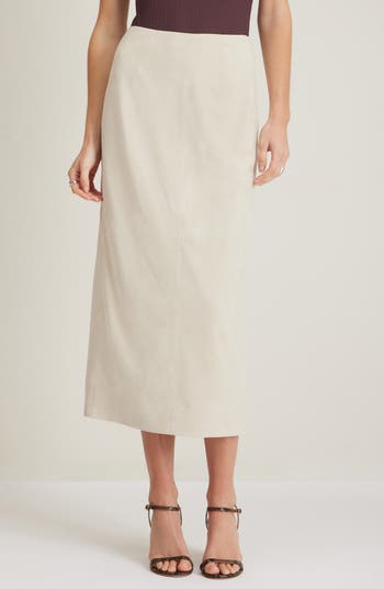 Vertical seams and a pencil-inspired silhouette bring rich structure and dimension to a stylish midi skirt shaped from supple suede.